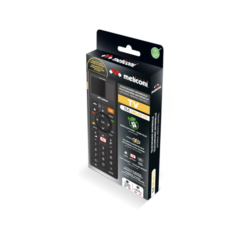 Univerzalni daljinski upravljalnik TLC Solar TV, s polnilno baterijo, ki se polni preko sončne celice ali priloženega USB-C kabla. Deluje s skoraj vsemi blagovnimi znamkami televizorjev na trgu.
