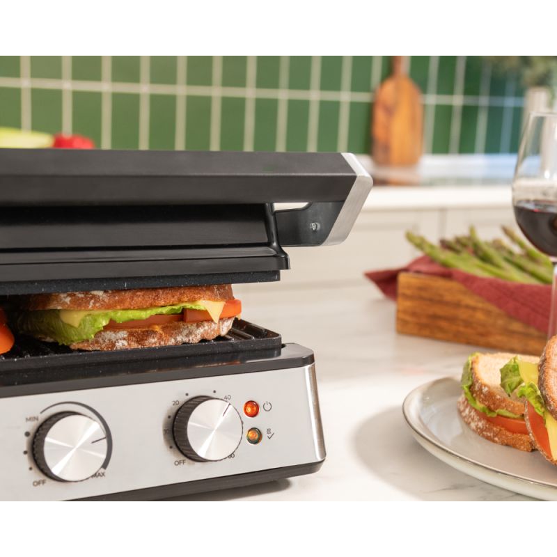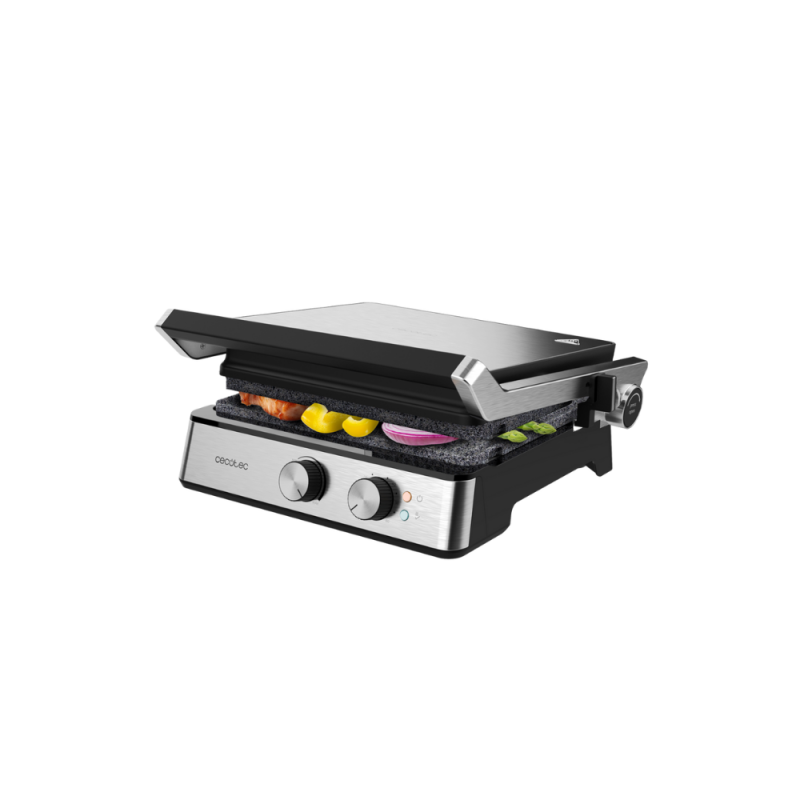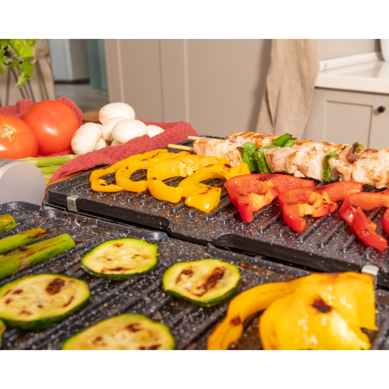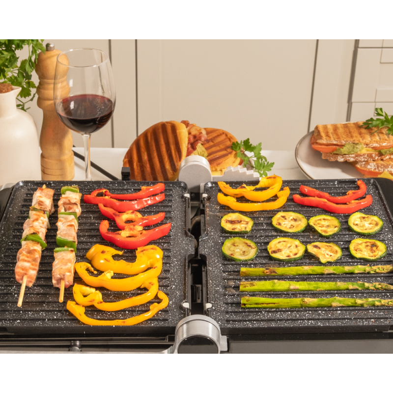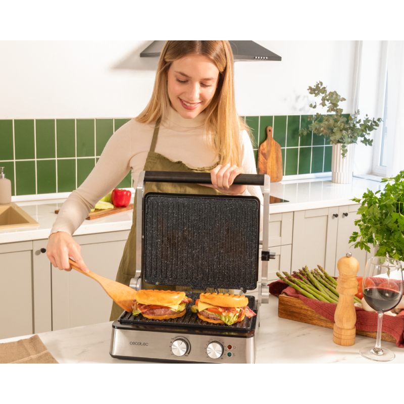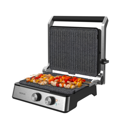 Cecotec Rock'n Grill Blaze je električni kontaktni žar, ki omogoča različne načine priprave hrane – pečenje, pripravo sendvičev in prigrizkov. Ponuja kar 2400w moči z 29 x 23 cm veliko kuhalno površino ter obojestransko uporabne plošče s prevleko RockStone, ki so snemljive in primerne za pomivanje v pomivalnem stroju.