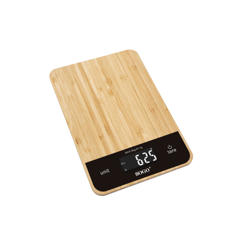 Kuhinjska tehtnica BAC-SS-3944 z ohišjem iz bambusa, ki ji ne daje le naravnega in elegantnega videza, temveč je tudi okolju prijazno. Njen sodoben LCD zaslon na dotik omogoča preprosto branje podatkov o teži ter zagotavlja udobno in napredno uporabniško izkušnjo. Z zmogljivostjo do 5 kg ali 11 funtov in impresivno natančnostjo 1 grama je ta tehtnica popoln spremljevalec za tehtanje sestavin z največjo natančnostjo. Poleg kilogramov in gramov lahko izberete enote za težo, kot so funti, unče ali mililitri, odvisno od vaših kulinaričnih želja in potreb. Funkciji Zero in Tare, poenostavita tehtanje sestavin v posodah. Tehtnica se samodejno izklopi, da prihrani energijo in podaljša življenjsko dobo baterije. Vključuje indikatorje preobremenitve in nizke baterije, ki zagotavljajo varno in nemoteno uporabo.