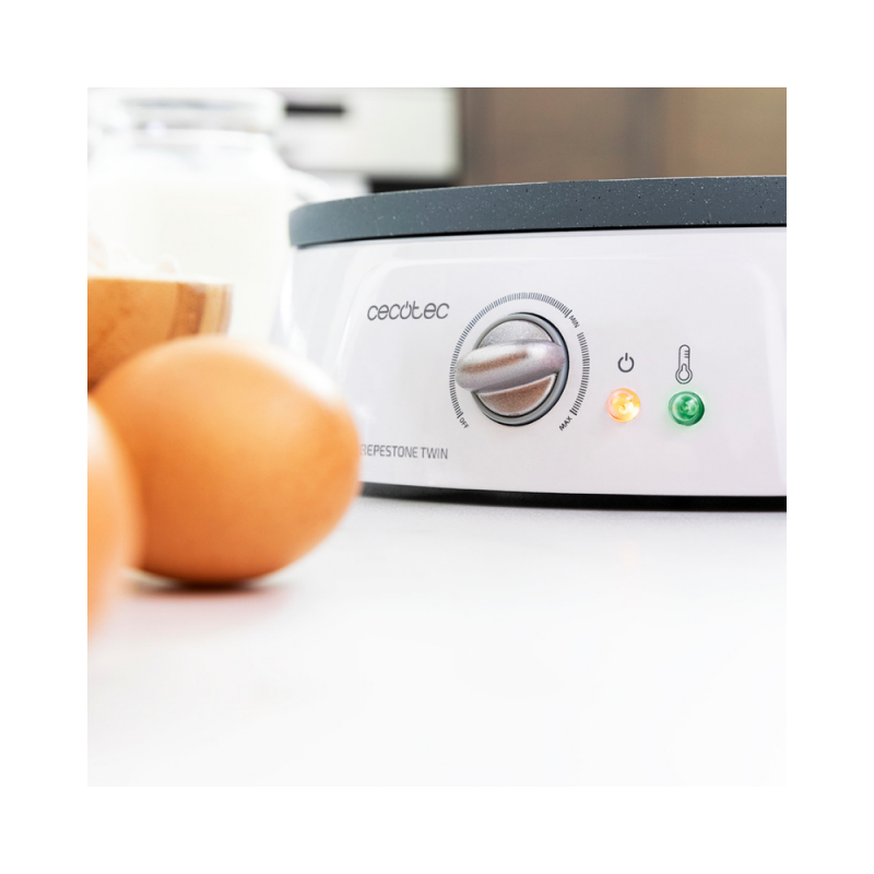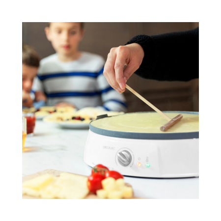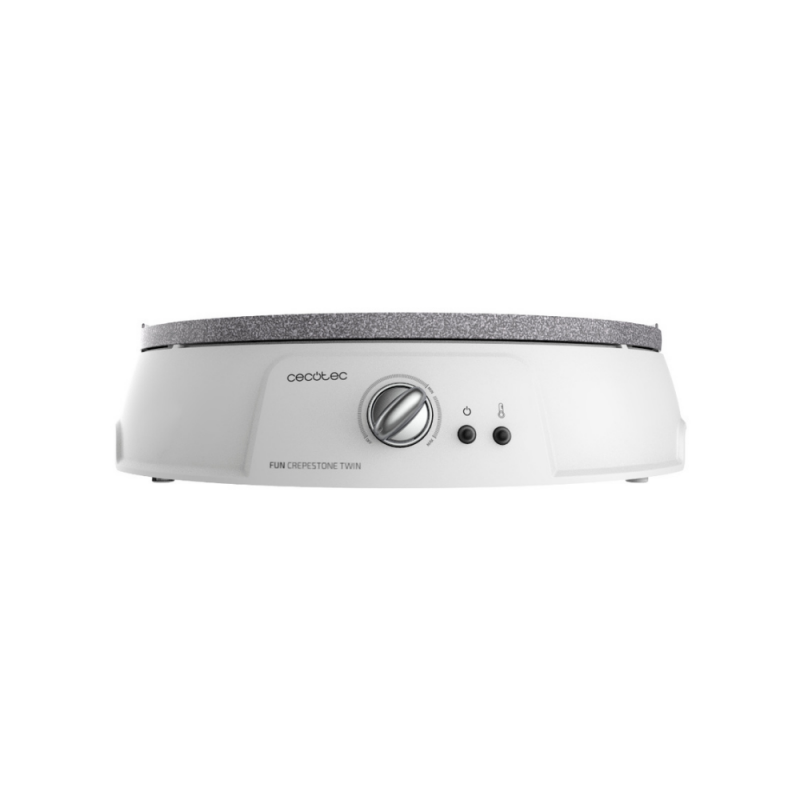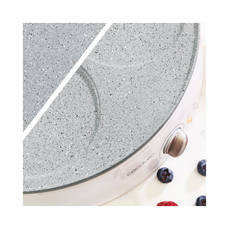 2-v-1 električni aparat za pripravo palačink Fun Crepestone Twin s premazom RockStone in 1200 W moči. Dvojna funkcija zahvaljujoč sistemu Twin, ki ga zagotavlja reverzibilna plošča, ki omogoča izdelavo ene velike palačinke ali 4 manjših palačink. Snemljiva plošča je primerna za pranje v pomivalnem stroju. RockStone premaz proti sprijemanju brez PTFE in PFOA, preprečuje lepljenje hrane in dosega najboljše rezultate. Priložena je lopatica za enakomerno razporeditev testa in lopatica za obračanje palačink. Moč je nastavljiva, za prilagajanje vsem okusom. Svetlobni indikator vam sporoča, kdaj je aparat za pripravo palačink pripravljen za kuhanje. Varna uporaba zaradi zaščite pred pregrevanjem. Plošča s premerom 30,5 cm.