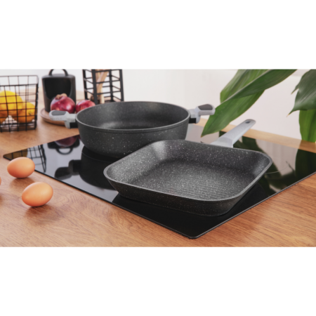 Žar ponev Polka Exclusive 28 Grill Wood&Rock, s premerom 28 cm. Izdelano iz kovanega aluminija s premazom proti sprijemanju Teflon®. Ponev je primerna za vse vrste štedilnikov in za pranje v pomivalnem stroju.